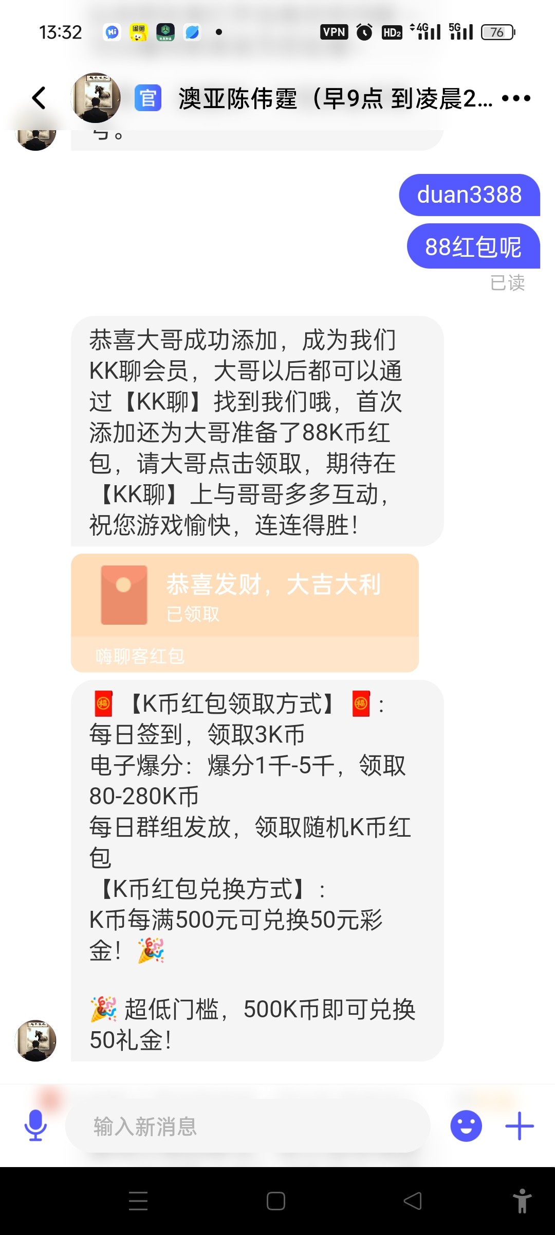 还有没有老哥知道其他的嗨聊客平台出来澳呀和非凡加加一个就可以领取88到了500换50彩金。