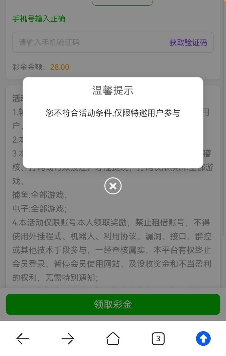 注册优惠里面自助申请彩金,手机号在特邀名单内的秒送,彩金只能玩电子棋牌捕鱼,十倍流水打到280提,只能提钱能钱包